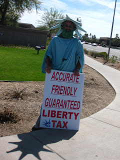 Yes, Lady Liberty (actually it's a dude) all dolled up for St. Patrick's day! He was holding this Liberty Tax sign and had dressed for St. Patrick's Day. Boy, had he. I asked him if I could take his picture and told him I didn't see that every day.